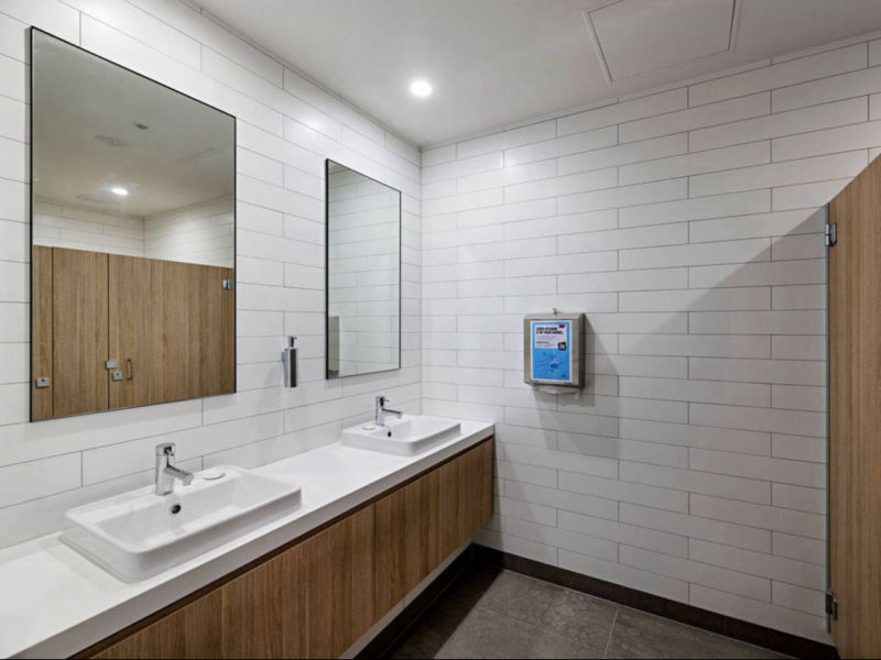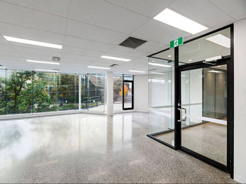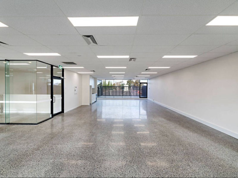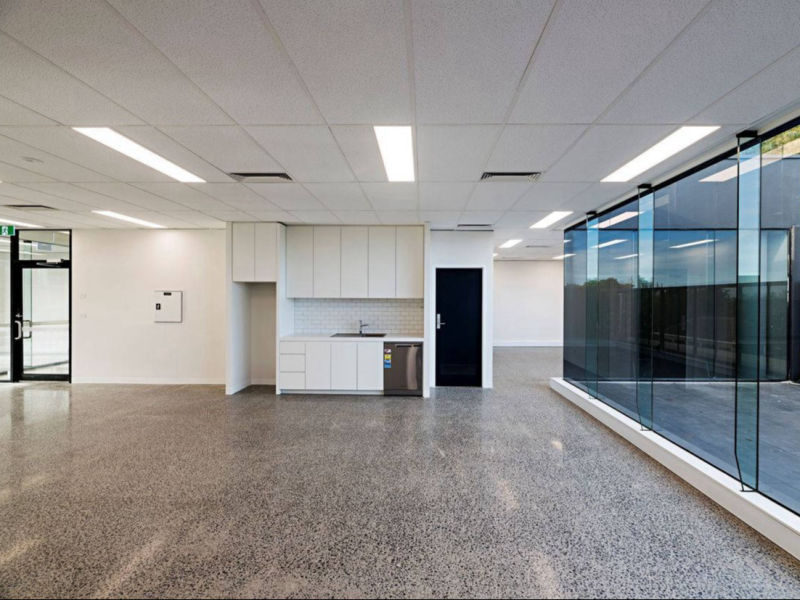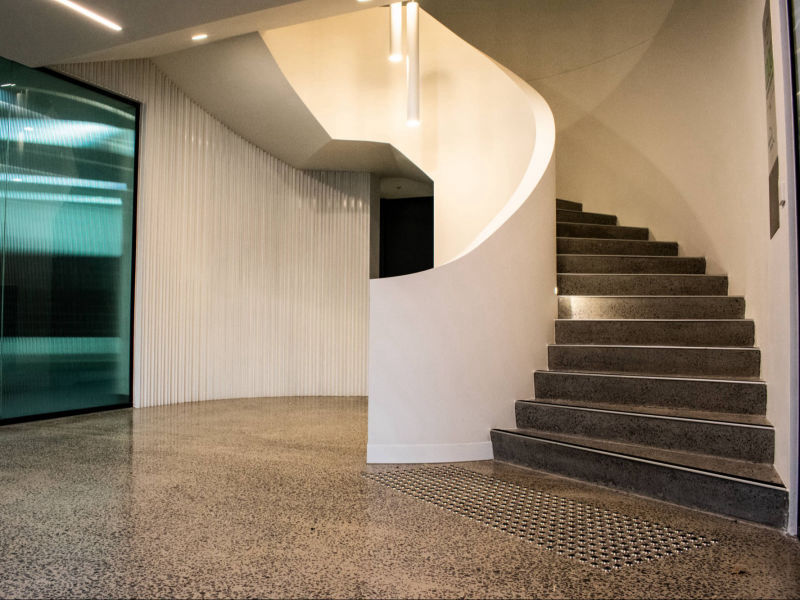 Description: We demolished and reinstalled new and improved finishes to this large office space, lobby and communal bathroom in Kew. The architecturally designed works included polished concrete floors, a feature curved plaster stair balustrade, new kitchenettes and bathrooms and painting throughout.