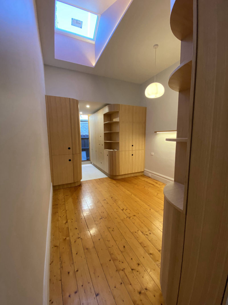 Description: We underpinned existing footings and extended master bedroom to include an architecturally designed walk in robe and ensuite with custom curved cabinetry.